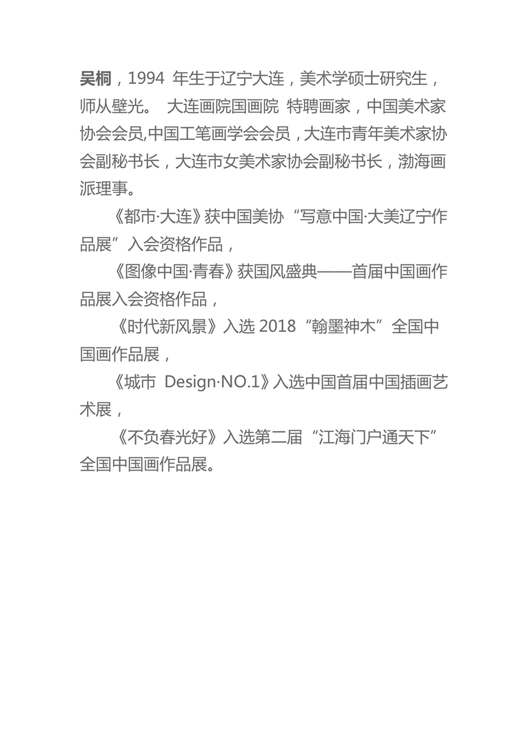 吴桐,1994 年生于辽宁大连,美术学硕士研究生,师从壁光。 大连画院国画院 特聘画家,中国美术家协会会员,中国工笔画学会会员,大连市青年美术家协会副秘书长,大连市女美术家协会副秘书长,渤海画派理事。